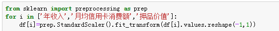 2)对年收入、月均信用卡消费额和押品价值三个连续型特征进行标准化处理,消除量纲的影响,同时提高算法求解的收敛速度。