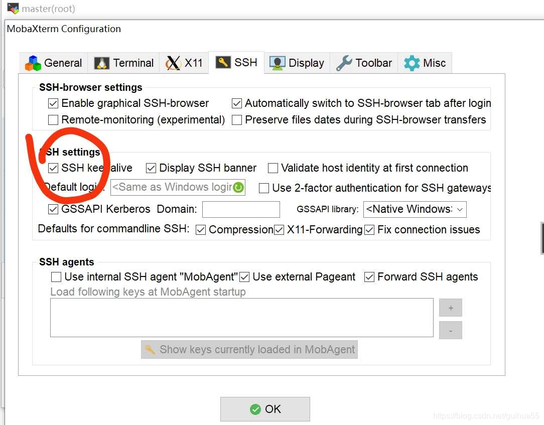 MobaXterm是默认关闭不保存连接信息的,故为了能一打开MobaXterm,就看到上次保存连接,我们需要设置一下:点击工具栏倒数第二个Settings,再点击SSH选项,然后钩中图中所示选项,点击OK完成!!!