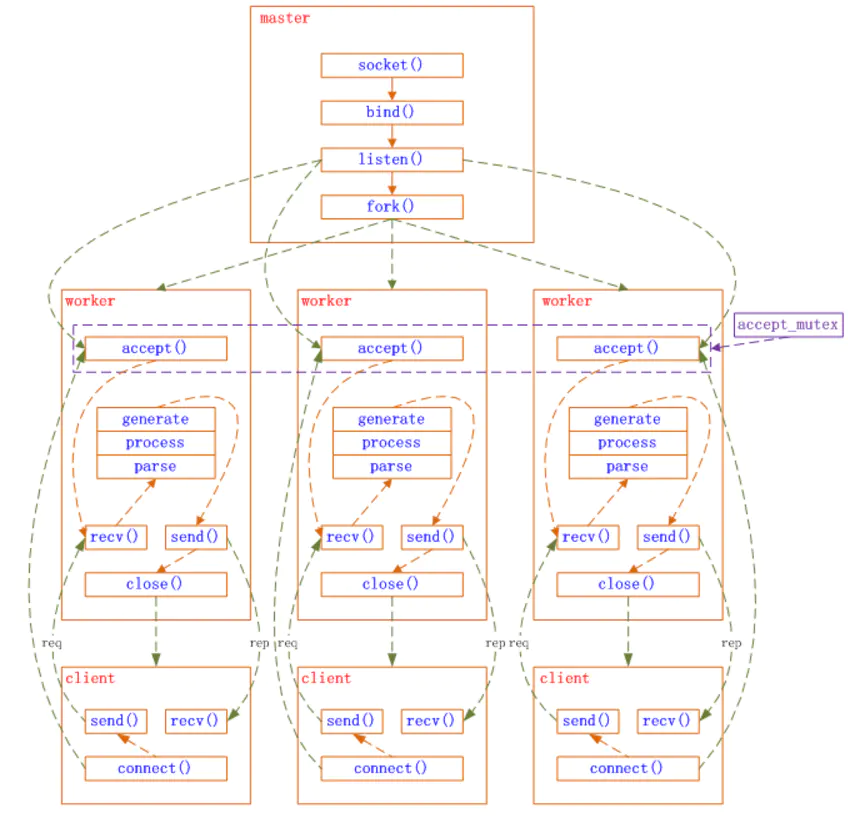 - master进程先建好需要listen的socket后,然后再fork出多个woker进程,这样每个work进程都可以去accept这个socket