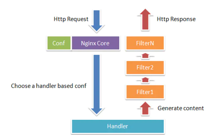 Nginx本身做的工作实际很少,当它接到一个HTTP请求时,它仅仅是通过查找配置文件将此次请求映射到一个location block,而此location中所配置的各个指令则会启动不同的模块去完成工作,因此模块可以看做Nginx真正的劳动工作者。通常一个location中的指令会涉及一个handler模块和多个filter模块(当然,多个location可以复用同一个模块)。handler模块负责处理请求,完成响应内容的生成,而filter模块对响应内容进行处理。