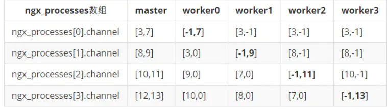 每一列数据都表示该列所对应进程与其他进程进行通信的描述符,如果当前列所对应进程为父进程,那么它与其它进程进行通信的描述符都为channel[ 0 ](其实channel[ 1 ]也可以);如果当前列所对应的进程为子进程,那么它与父进程进行通信的描述符为channel[ 1 ](注:这里书中说的太简略,应该为如果当前列所对应的进程为子进程,那么它与父进程进行通信的描述符为该进程的ngx_processes数组中,与本进程对应的元素中的channel[ 1 ],在图中即为标粗的对角线部分,即[-1,7],[-1,9],[-1,11],[-1,13]这四对),与其它子进程进行通信的描述符都为本进程的ngx_processes数组中与该其它进程对应元素的channel[ 0 ]。