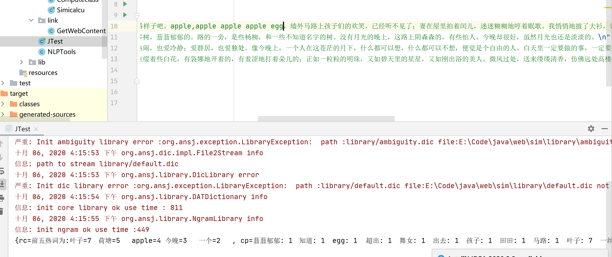 根据上述的简单需求,我就想用原生JAVA通过某些数据结构实现,由于知识面有限且笔者目前是名在校的学生,实现了英文下的分词、中文下的分词。但是遇到中英文混排的怎么也合并不了。经过两天的各种思考各种分析结果以失败告终。在查阅资料的时候发现了阿帕奇的OpenNLP 工具,然后仔细的看了看源码。。看的也是云里雾里的,但基本思想也了解了。虽然阿帕奇的OpenNLP很牛逼,但是我还是选择了一个国人自产基于n-Gram+CRF+HMM的分词JAVA实现。具体开发文档和源码可以访问GITHUB。