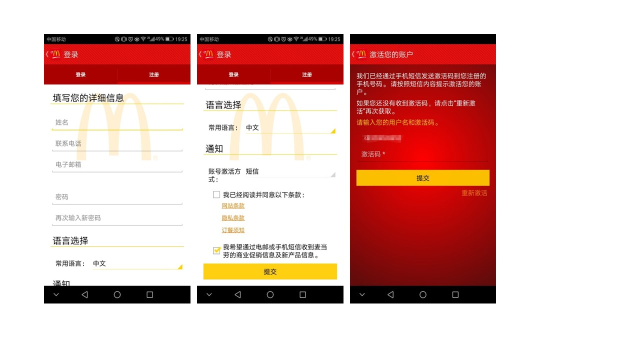 麦当劳的注册流程比较繁琐,一上来就需要输入一大堆表单信息,容易让用户望而生畏,而且麦当劳其他流程页面跳转率都比较多,建议对缩短整个流程。
