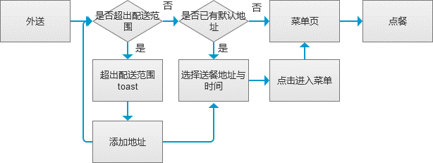 取消让用户选择送餐地址和时间的行为,当点击外送时,直接定位到用户目前的地址,因为我认为用户进行点餐时大部分情况是目标非常明确的行为,而且和目前地址相关,并不需要用户再次进行点选。至于选择送餐时间,可以将其合并至订单页的送达时间。