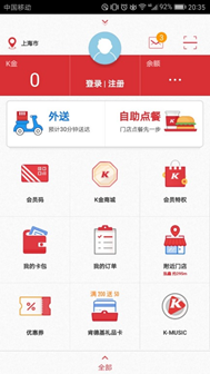 肯德基APP的核心功能主要是外送点餐和自助点餐,首页以卡片+阴影形式强化这两个核心功能。
