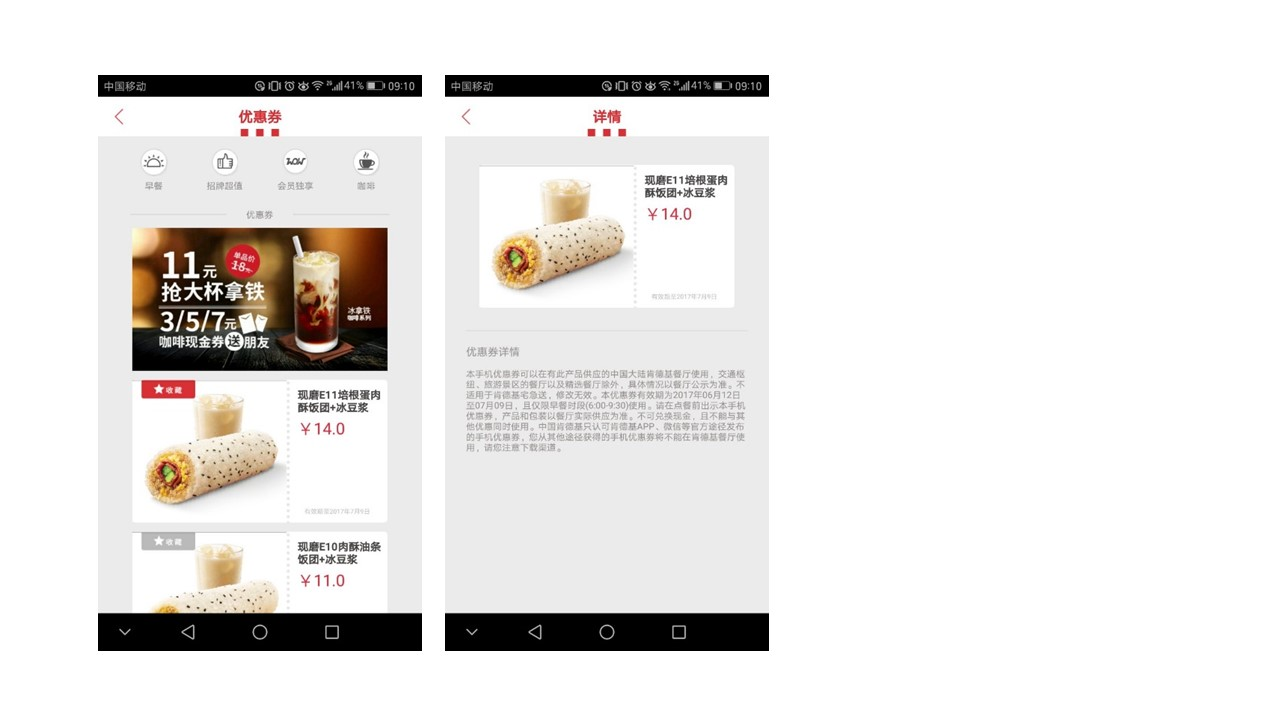 肯德基网上订餐APP,满足了用户线上快速点餐,线下便捷取餐的需求。另外,app提供各种形式的优惠,吸引用户使用app。
