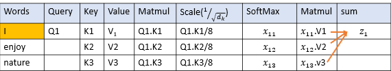 我们应用归一后的分数和值向量之间的点积,然后计算总和