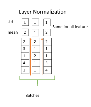 层标准化:对每个特征的输入进层标准化,并且与其他示例无关,如下所示。层标准化减少了前馈神经网络的训练时间。在层标准化中,我们在一个单一的训练案例中,计算所有层神经元的累加输入的平均值和方差。