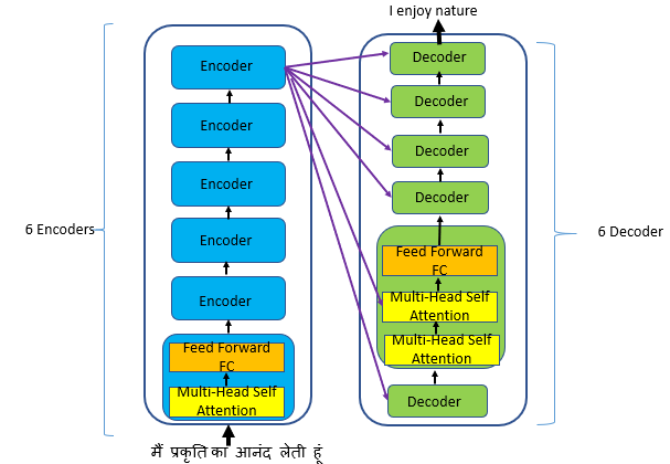 在机器翻译任务中,使用Transformer将一个句子“I enjoy nature”从英语翻译成印地语,解码器将考虑所有输入的单词“I, enjoy, nature”来预测第一个单词。