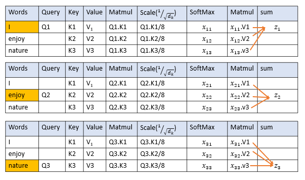 Transformer中的注意函数被描述为将查询和一组键值对映射到输出。查询、键和值都是向量。注意力权值是通过计算句子中每个单词的点积注意力来计算的。最后的分数是这些值的加权和。