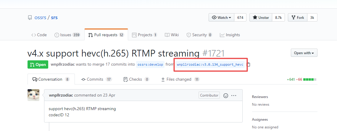 支持 h.265 的 commit 版:https://github.com/ossrs/srs/tree/e5b72aad2060277dc408bed9561e7c86edc31414/trunk (https://github.com/wnpllrzodiac/srs/tree/v3.0.134_support_hevc)