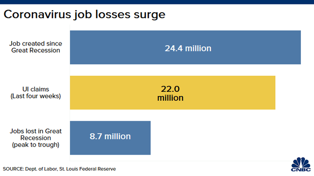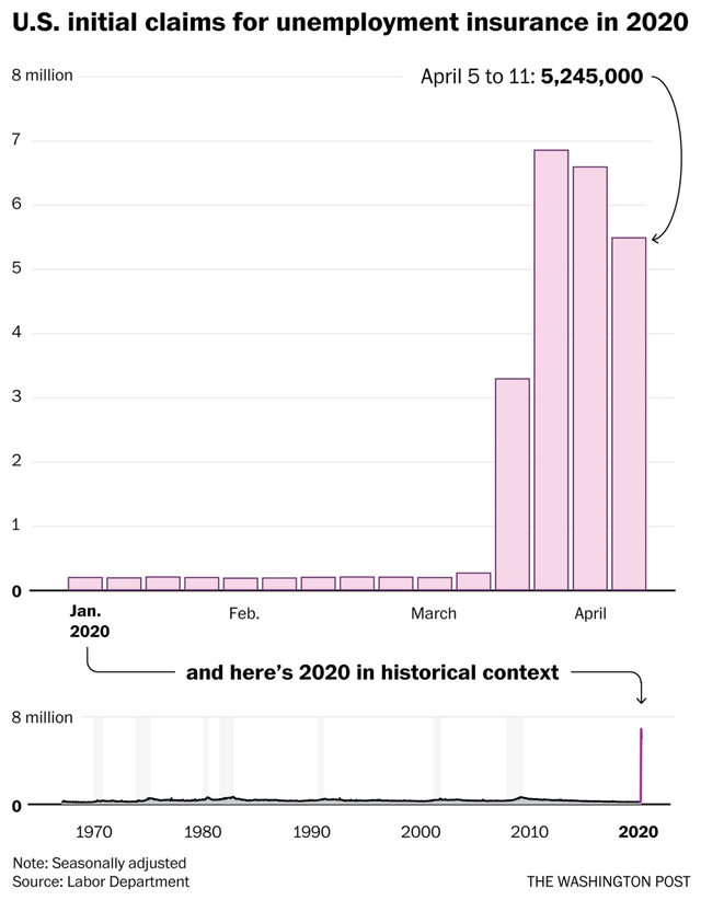 美国劳工部16日公布的数据显示,受新冠疫情在美国蔓延影响,上周美国首次申请失业救济人数达到524.5万,这意味着过去四周美国首次申请失业救济人数已累计达到约2200万,这约占美国劳动力总数的八分之一,基本抹去了08年金融危机以来过去11年所有的新增就业。