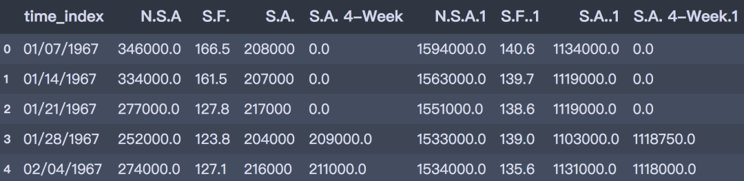 首先使用pandas读入数据,我们选取的数据来自于美国劳工部官方网站,数据包含了从1967年07月01日~2020年04月04日的申请失业保险人数,这是一份带有时间序列的面板数据,适合进行动态可视化绘图使用。