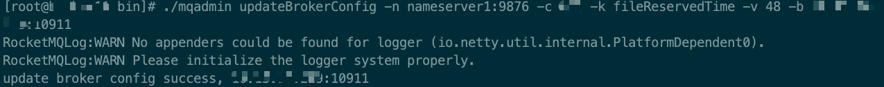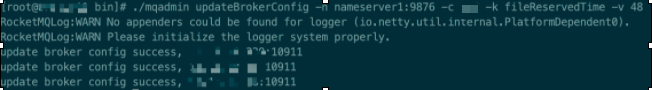 ./mqadmin updateBrokerConfig -n nameserver1:9876 -c CLUSTERNAME -k fileReservedTime -v 48 -b 192.168.2.11:10911