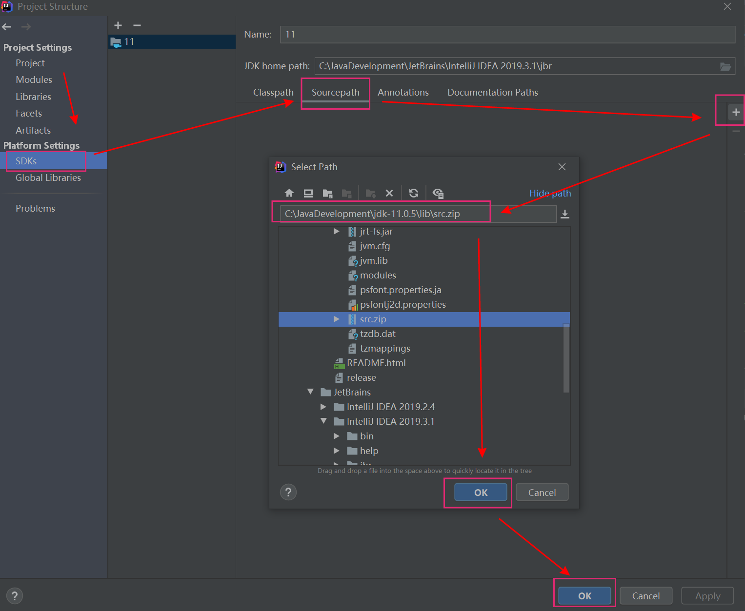 1.点击菜单 File ->Project Structure,点击SDKs,在Sourcepath中添加源码文件,一般安装jdk后,Java安装目录中有一个src.zip文件,这个就是源码。 来源:oschina链接:https://my.oschina.net/u/4108547/blog/4330334 标签 JDK IntelliJ IDEA java