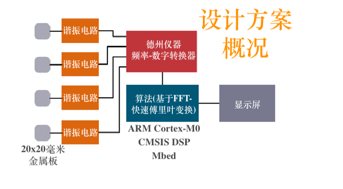 为了将人类用户接入系统,需要待用户尝试在空中触摸虚拟按钮时对电容进行某些修改。我决定采用一种“自电容”方法,即将谐振电路的一端连接到一块金属板上。附近人员的手指会与身体产生一个电容,而身体会有一个对地电容。类似地,金属板将有一些对地电容。手指的出现带来的电容变化很小,但可被测得。传统的电容式触控传感器的测量方法不够精细或低噪音,而谐振电路频率测量的方法却有这些优势!即使在一定距离之外,手指的出现也会在被测电容中产生明显的差异。