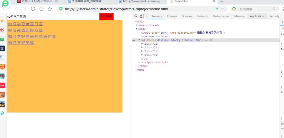 可以看到,搜索结果已经出来了,而且有序列表下的"li"标签也都对应的生成了。