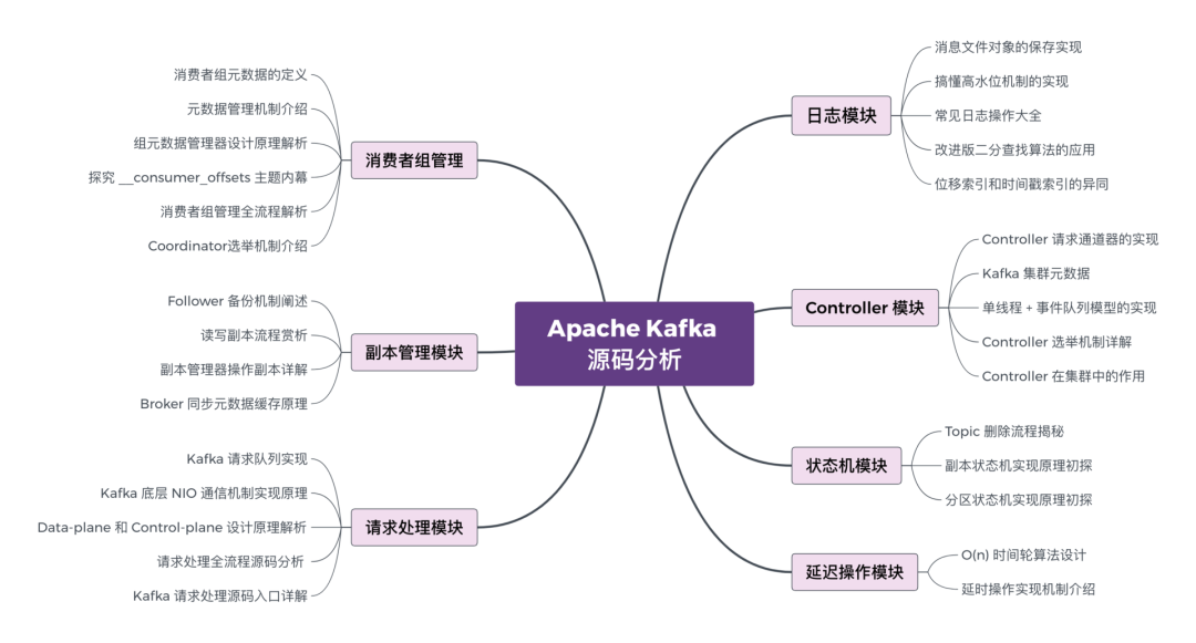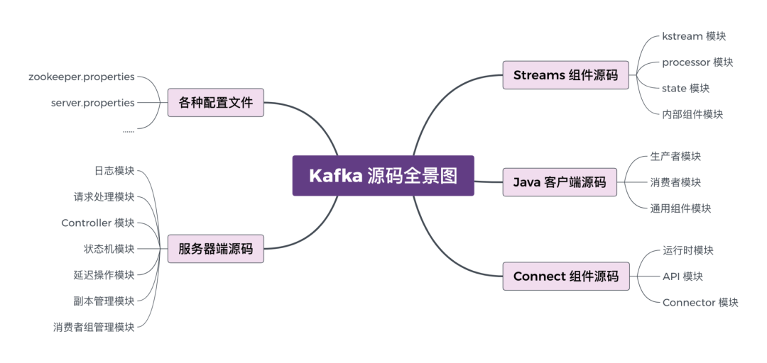 这里,分享给你一张 Kafka 源码全景图。从功能上讲,Kafka 源码分为四大模块。其中,服务器端源码是理解 Kafka 底层架构,特别是系统运行原理的基础,其他三个模块源码都很依赖它。因此,要解读 Kafka 源码,要先拿下服务器端代码。