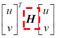 u和v表示窗口移动的方向, H表示Harris矩阵,主要由图像梯度表示。