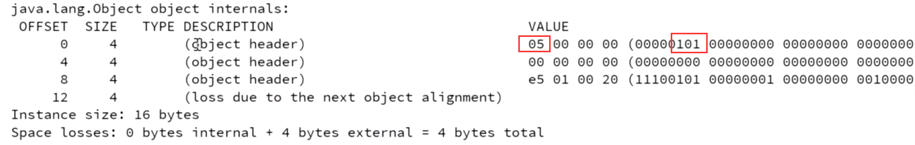 (1) 当我们创建一个无锁态对象的时候:25位没有用;31位装的identity Hashcode,但是只有在被调用的时候,才填充,没有调用的时候是空的;1位没有使用的;4位分代年龄(解释在下面);1位偏向锁位;2位锁标志位。