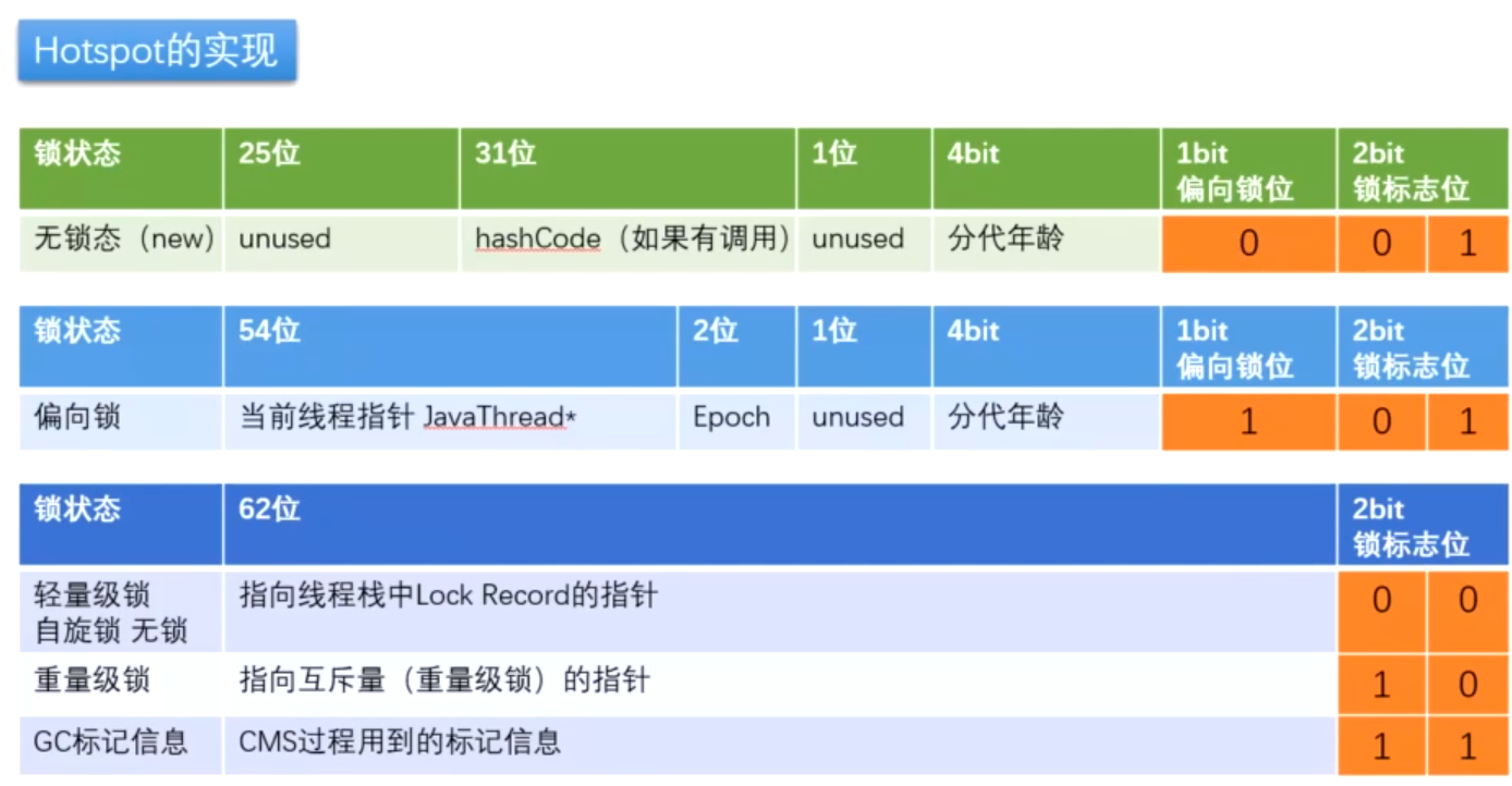 (3) 自旋锁:62位指向线程中的Lock Record的指针。Lock Record与锁重入有关,synchronize默认是可重入的。自旋锁在竞争锁的时候,会在自己的内存中创建一个Lock Record对象,抢到锁对象的资源时,锁对象头存的就是这个线程的Lock Record对象的指针,所以在重入的时候,会再创建一个Lock Record对象,利用Lock Record来记录到底琐了多少次。解锁的时候,就将一个Lock Record移除。