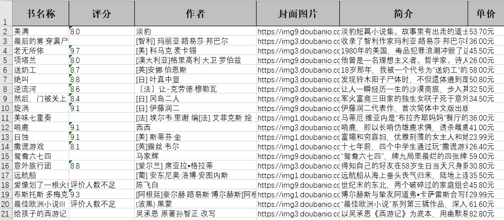 获取豆瓣读书 -> 新书速递中每本新书的基本信息。包括:书名、书图片链接、作者、内容简介(详情页面)、作者简介(详情页面)、当当网书的价格(详情页面),最后将获取的数据保存到 Excel 文件。