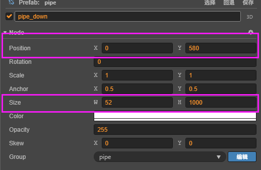 然后来编辑这两个水管,首先先让水管的x值都为0,y值让pipe_down为580,pipe_up为-580,宽度为52,长度为1000(长度1000是为了让他可以超出屏幕,不会被玩家看到尾部,y值为580的目的是长度的一半是500,然后就会多80的间隙,两个水管都这样设置就会在中间有160的间隙,可以让鸟通过):