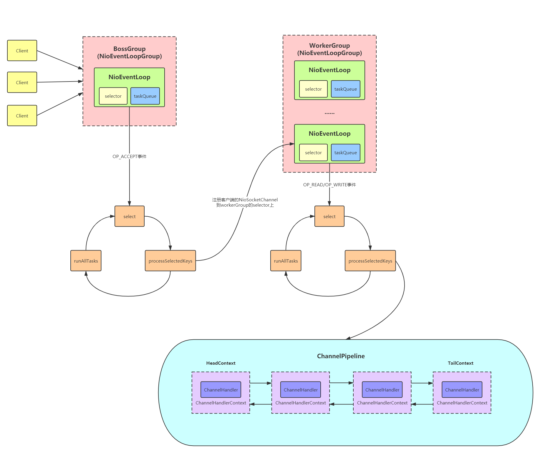 - select:BossGroup中的select方法是用来处理accept事件,WorkerGroup中的select方法是用来处理read或write事件,而客户端的select方法是用来处理connect、read或write事件;