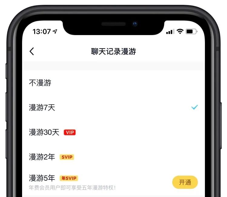 反观隔壁更年轻的聊天软件 QQ,采取了付费“漫游聊天记录”的方式。