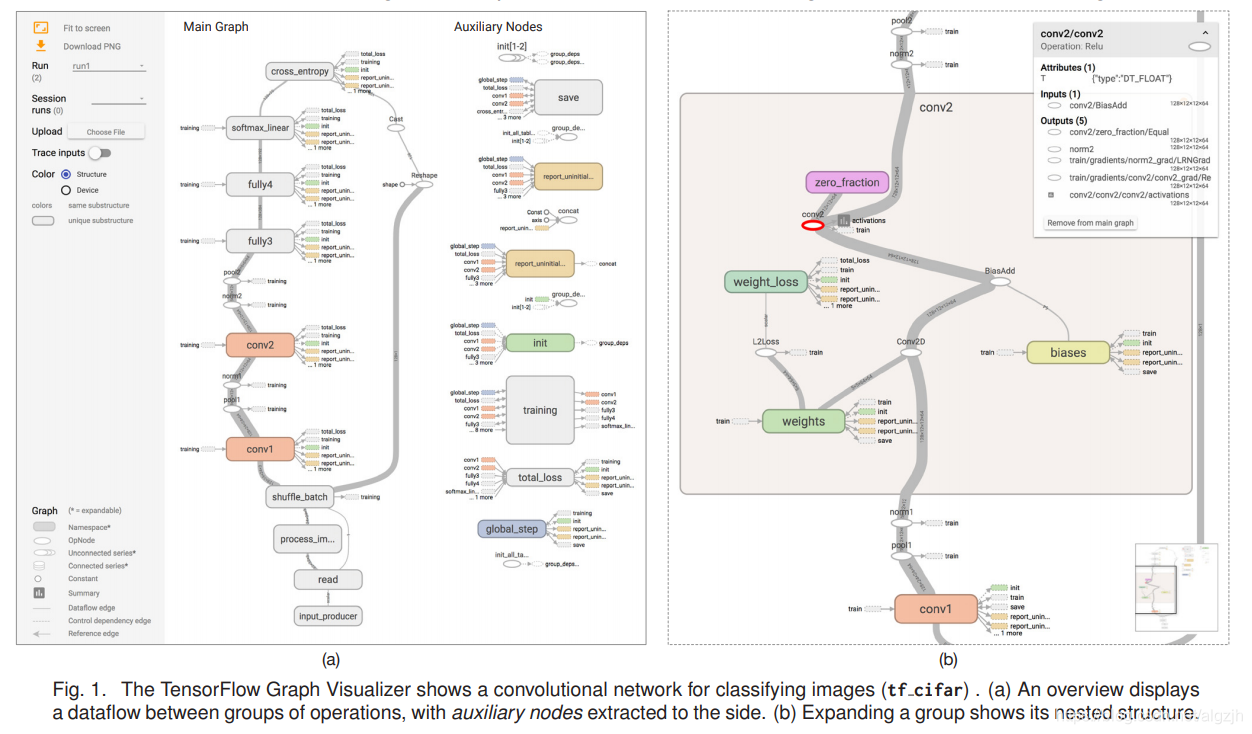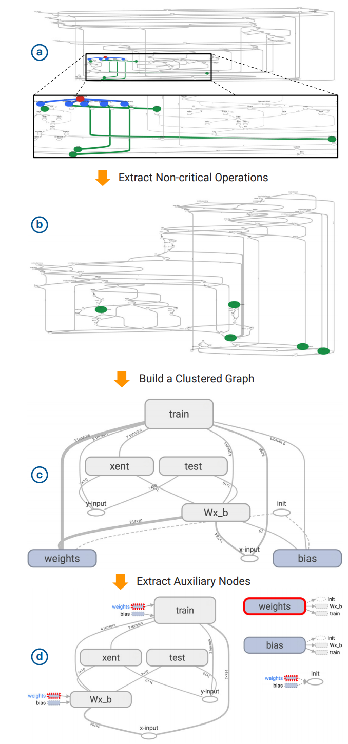 我们介绍了TensorFlow Graph Visualizer,它是 TensorFlow 机器智能平台的一部分。该工具通过可视化其基础的数据流图来帮助用户了解复杂的机器学习架构。该工具通过应用一系列图转换,使得标准布局技术能够生成清晰的交互式图表。至于整理图,我们将非关键节点与布局分离。为了提供概述,我们使用源代码中注释的层级结构。为了支持按需探索嵌套结构,我们执行边绑定以实现稳定且响应迅速的集群扩展。最后,我们检测并突出显示重复的结构,以强调模型的模块化组成。为了演示可视化工具的实用性,我们描述了示例使用场景并报告了用户反馈。总体而言,用户发现可视化工具对于理解、调试和共享其模型的结构很有用。