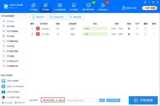 接下来看界面的下方,有一个输出目录,这里可以选择原文件夹目录,也可以选择自定义,原文件夹目录也就是此前保存PDF文件的目录,自定义的话就是自己设置保存路径,大家根据自己的需要选择设置就可以了,完成之后,直接点击后方的“开始转换”即可。