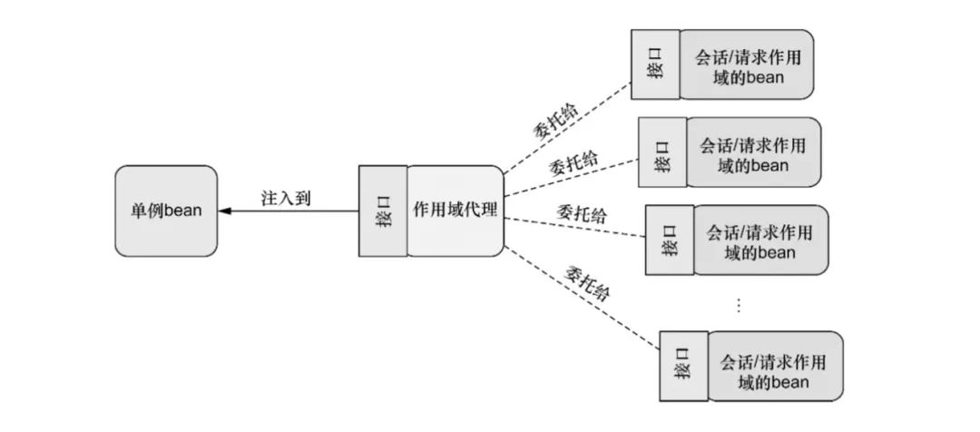 因为StoreService是一个单例的bean,会在Spring应用上下文加载的时候创建。当它创建的时候,Spring会试图将ShoppingCart bean注入到setShoppingCart() 方法中。但是ShoppingCart bean是会话作用域的,此时不存在。直到某个用户进入系统,创建了会话之后,才会出现ShoppingCart实例。