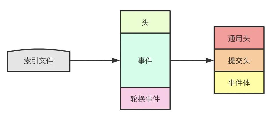 binlog日志的结构大概是长这样的,它由索引文件和binlog文件组成,其中binlog事件又包含通用头、提交头和事件体3个部分组成。