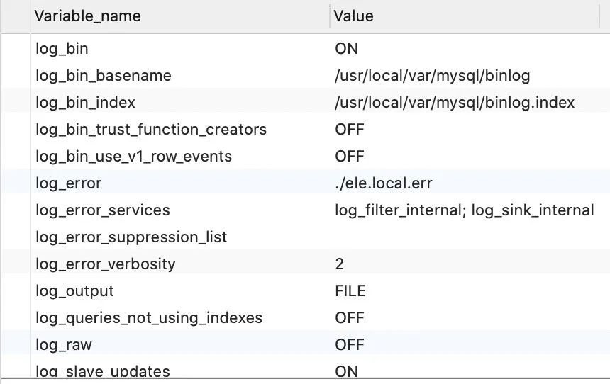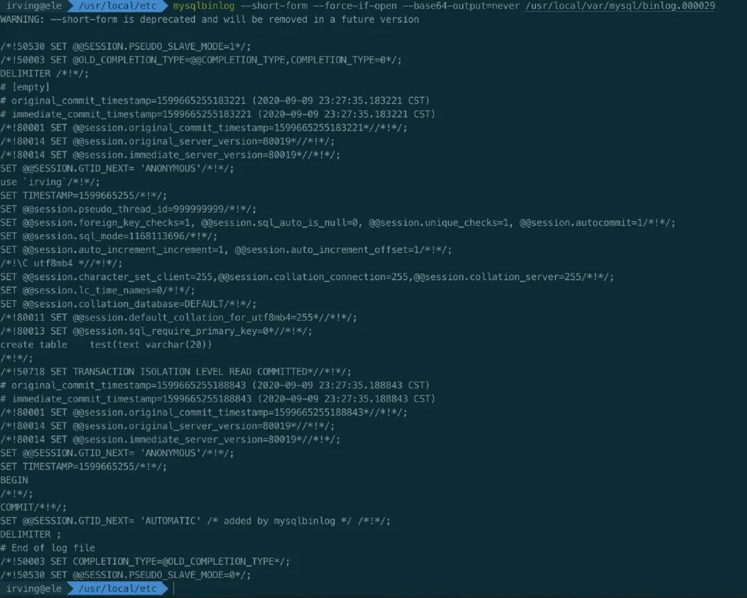 mysqlbinlog --short-form --force-if-open --base64-output=never /usr/local/var/mysql/binlog.000029