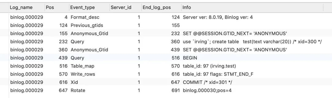 从日志我们可以看到执行了创建表的语句以及一个Format_desc头和Ratate轮换事件,这个我们会在后面讲到,先看几个字段代表的含义。