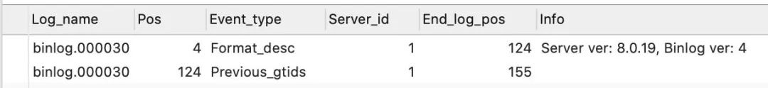 显示刷新,flush logs将所有日志写入磁盘,这时候会创建一个新的文件写入,从第一个例子也能看出来执行完之后生成了一个新的日志binlog.000030的文件并且开始的位置是4。