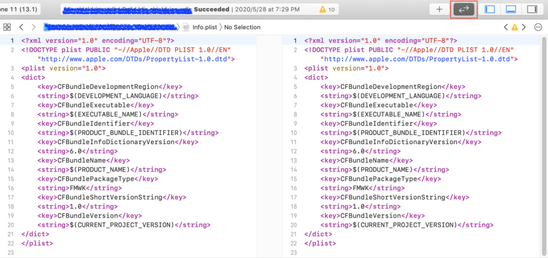 • 在编辑器中显示 plist 文件,然后点击工具栏上的 Show or Hide Code Review 按钮。这个按钮是用于代码审查的,会将编辑器分成左右两个窗口显示更改前后的源代码,在这种情况下,plist 会以源文件的形式展示。