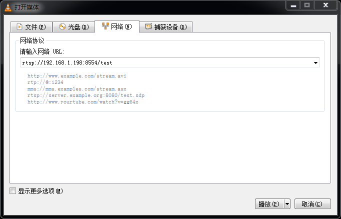 2、再打开一个VLC,打开网络播放,添加上一步我们设置的SDP 路径rtsp://192.168.1.198:8554/test