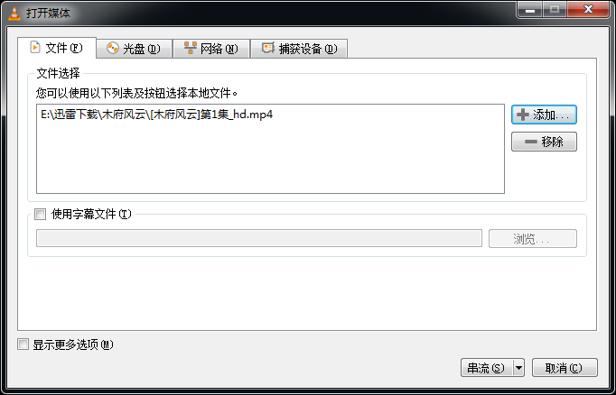 2、选择文件选项卡,添加一个视频文件,基本vlc可以播放的都能添加。