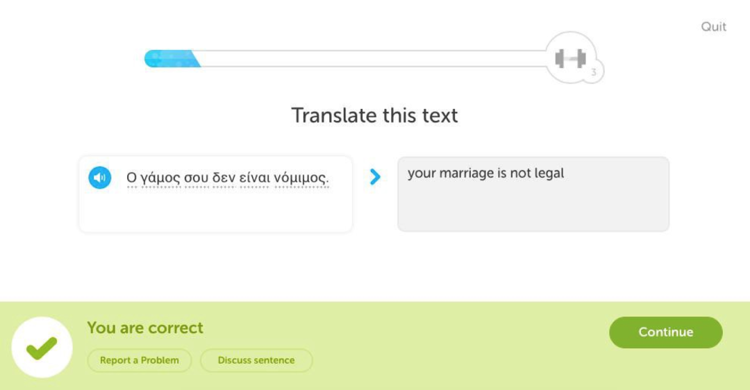在Duolingo学习任何一种语言时都不会随机分配单词。有时候,是随机分配一个句子来翻译;还有些时候,句子不是随机的,而是节选自Duolingo众多客户的某篇文章——比如CNN和纽约时报。