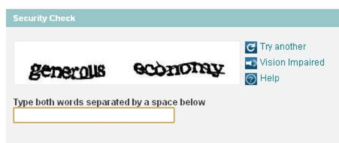 第一个单词出自公司通过扫描已经确定下来的那部分词汇,它是用来测试用户是否是人类的。而第二个单词是从他们还不确定的那部分词汇里选出,一旦有10个用户输入了某个相同的单词,他们就知道这是正确答案。