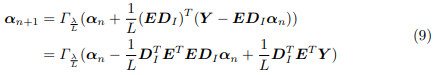 To solve (8), a common approach is to use iterative shrinkage thresholding algorithm (ISTA) [7]. At the n-th iteration, the sparse code is updated as: