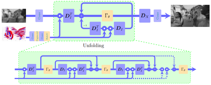 Inspired by [14], we can solve the sparse coding problem efficiently by integrating it into the CNN architecture. Therefore we propose an Event-enhanced Sparse Learning Net (eSL-Net) to solve problems of noise, motion blur and low spatial resolution in a unified framework.