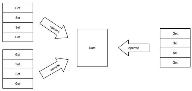 当多线程的时候,任意读写,实际上就是导致标准的 race condition,大部分情况下我们是不知道执行结果的。对于单核cpu来说,多线程实际上是cpu模拟,可以理解成所有的操作是合并到一起顺序执行的。在我们不加以控制的前提下,合并的操作队列必然是相对之间无序的。要想多线程情况下,达到单线程一样的事务性。最简单粗暴的办法,就是保证所有请求串行。