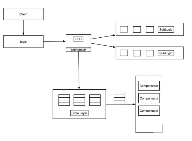 分布式事务组件流程如下,当用户请求进入上层服务的时候,在当前线程上下文生成一个唯一的事务ID做标示事务组,rpc组件在上层服务中调用原子层时,会把事务组内所有对远程的原子层的调用,记录为一个事务组,持久化到远端储存层。