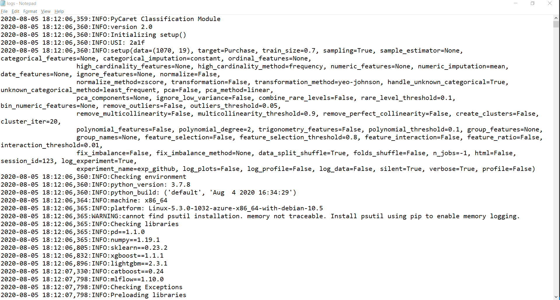 这是PyCaret生成的系统日志文件。这可用于审核流程。它包含重要的元数据信息,对于解决软件中的错误非常有用。