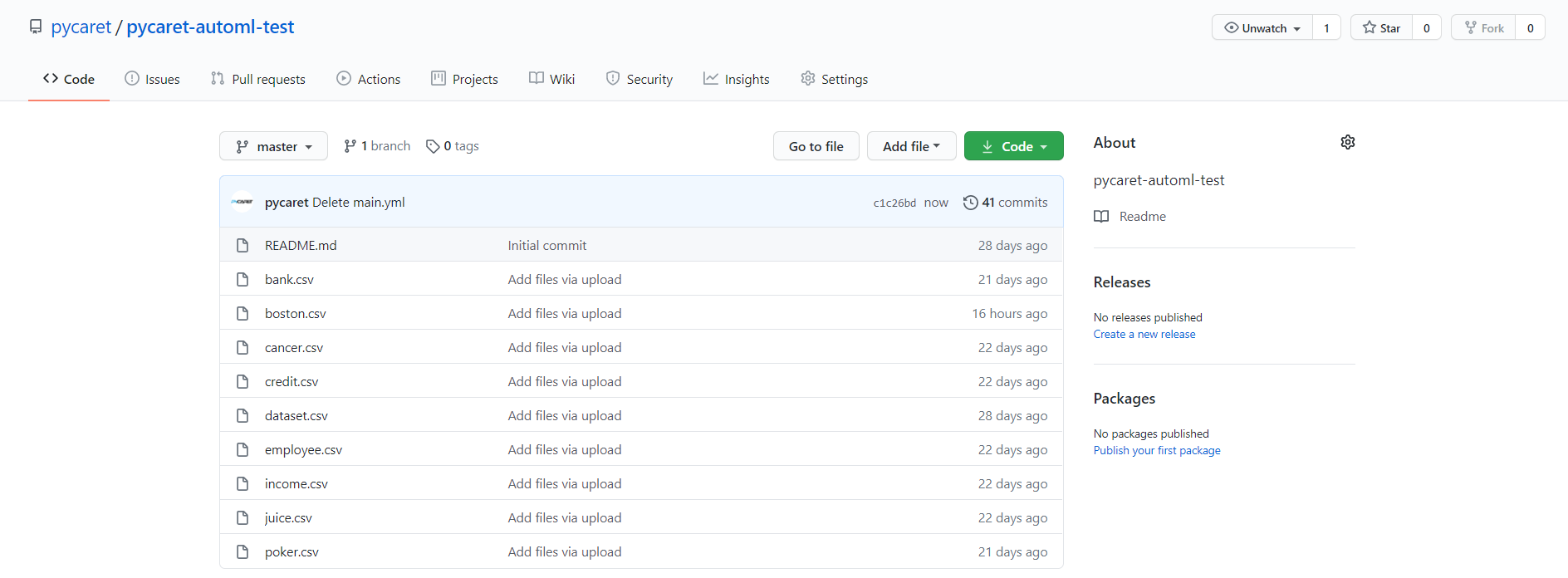 为了安装和测试我们刚刚创建的软件,我们创建了一个新的存储库pycaret-automl-test:https://github.com/pycaret/pycaret-automl-test,并上传了一些用于分类和回归的示例数据集。