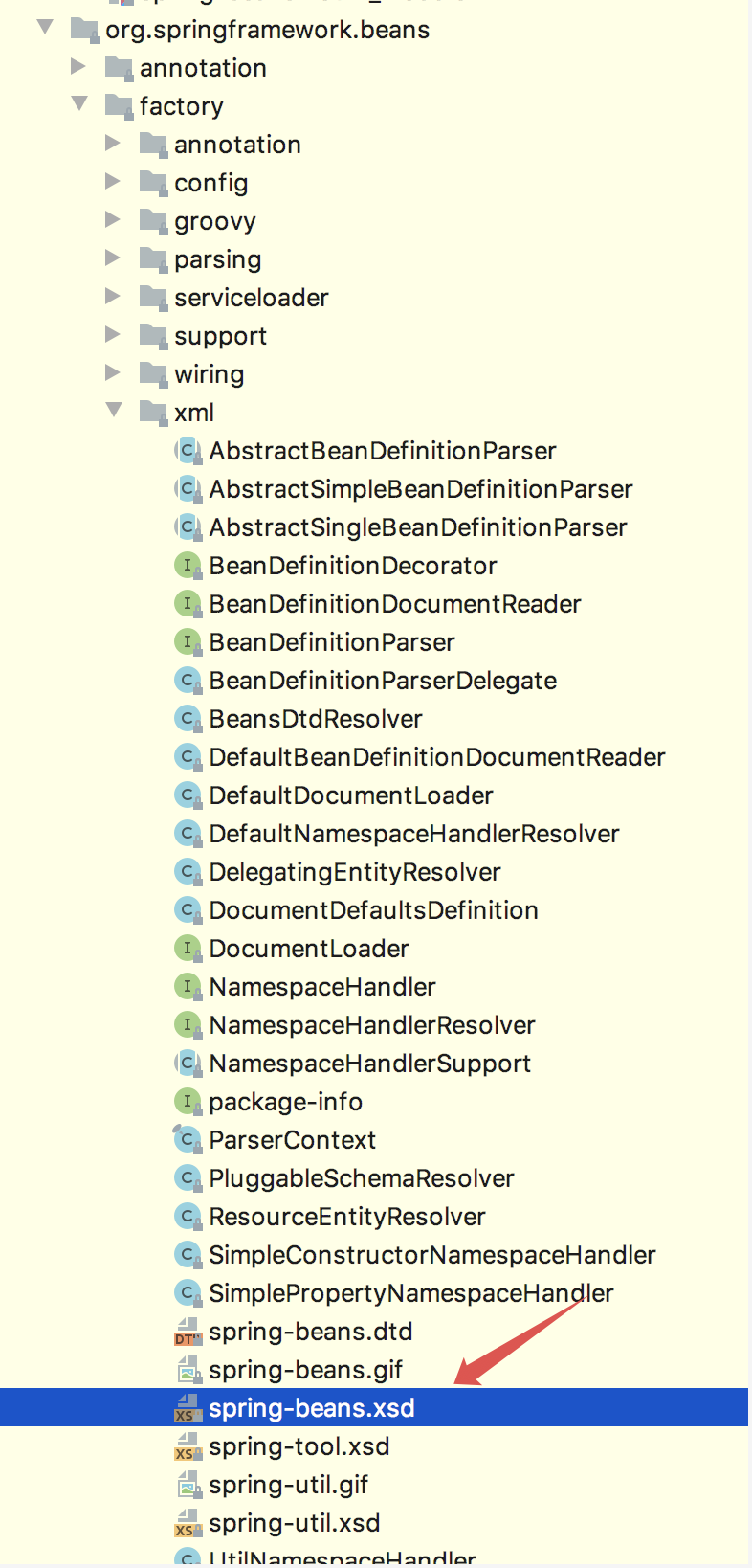 可以看到,各种版本以及没有版本号的约束文件,都对应了同一个文件,就是 org/springframework/beans/factory/xml/spring-beans.xsd,打开这个文件目录,我们就可以看到约束文件: