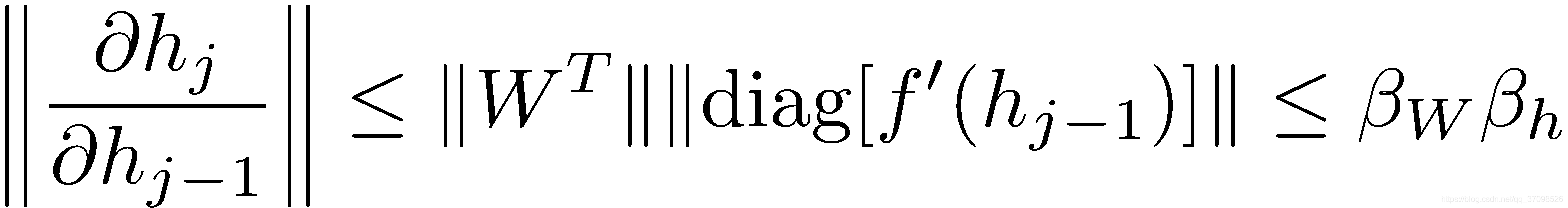 这个式子最中间的部分最值得关注,因为它是一个连乘的形式,长度为时间区域的长度。记βW 和 βh分别为矩阵和向量的范数(L2),则上述雅克比矩阵的范数满足: