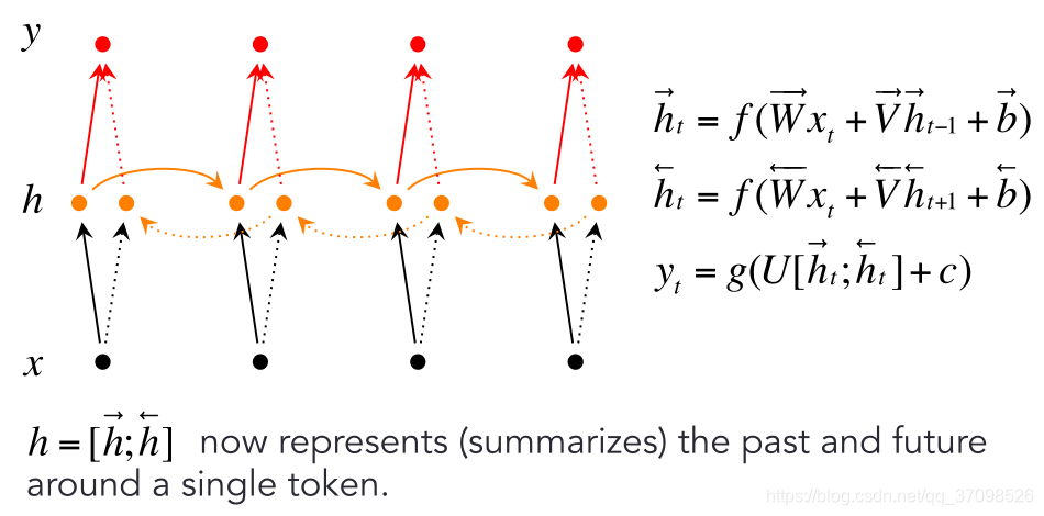 这里箭头表示从左到右或从右到左前向传播,对于每个时刻t的预测,都需要来自双向的特征向量,拼接后进行分类。箭头虽然不同,但参数还是同一套参数(有些地方是两套参数)。